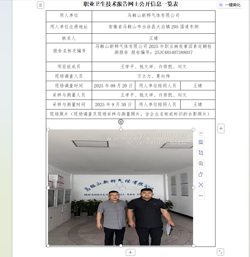 马鞍山新桦气体有限公司2025年职业病危害因素定期检测