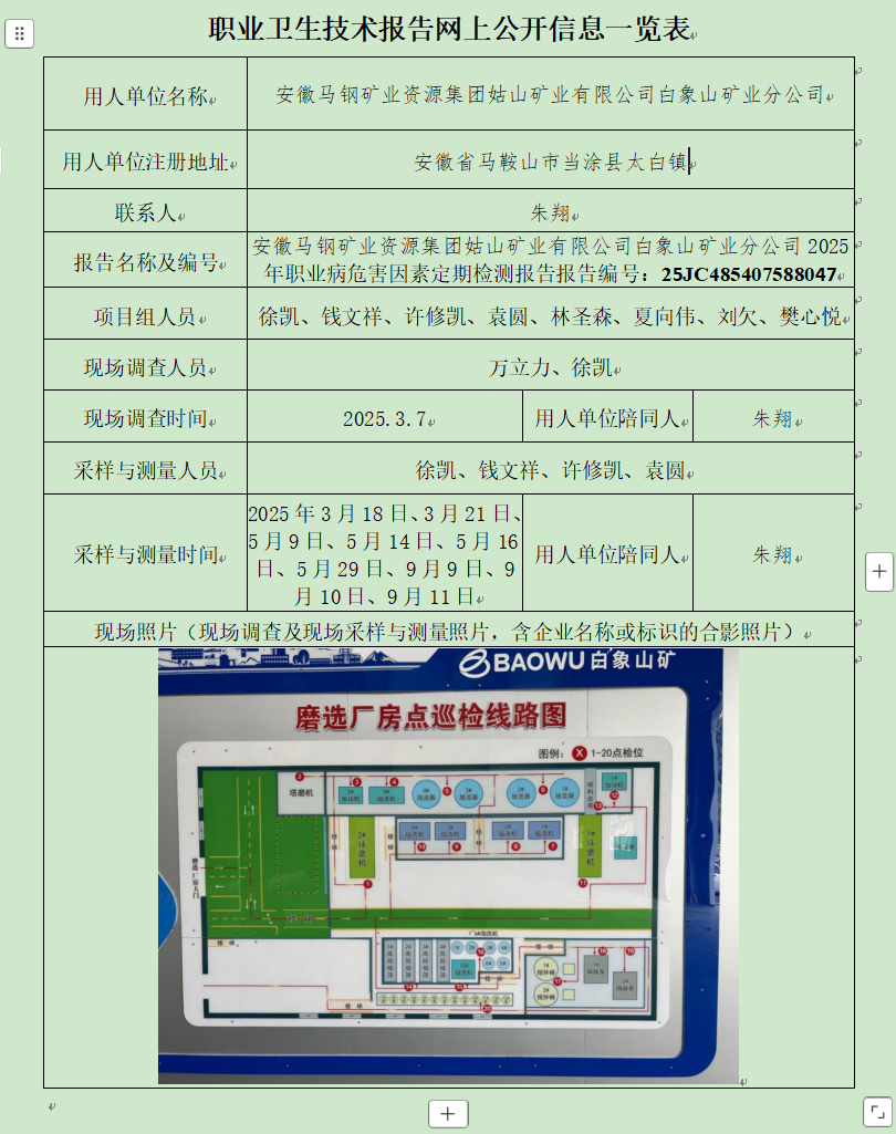安徽马钢矿业资源集团姑山矿业有限公司白象山矿业分公司2025年职业病危害因素定期检测报告