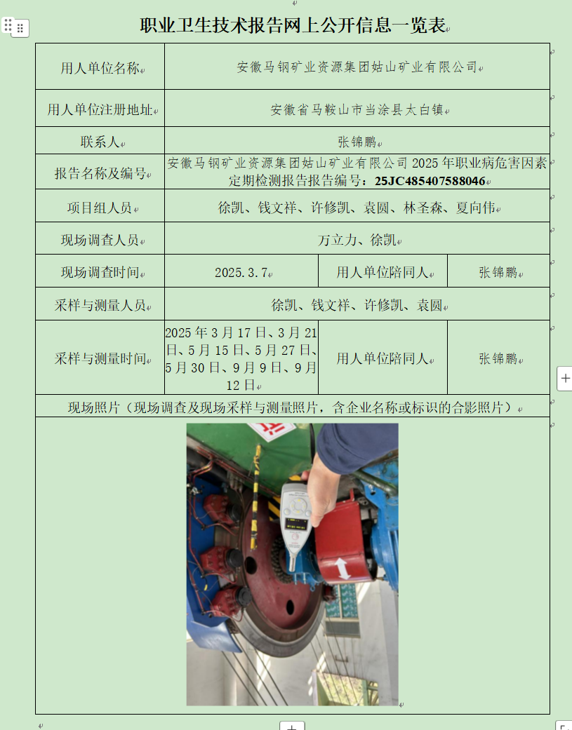 安徽马钢矿业资源集团姑山矿业有限公司2025年职业病危害因素定期检测报告