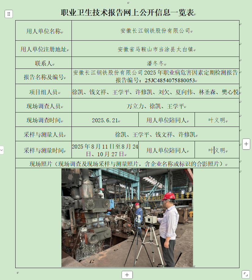 安徽长江钢铁股份有限公司2025年职业病危害因素定期检测报告