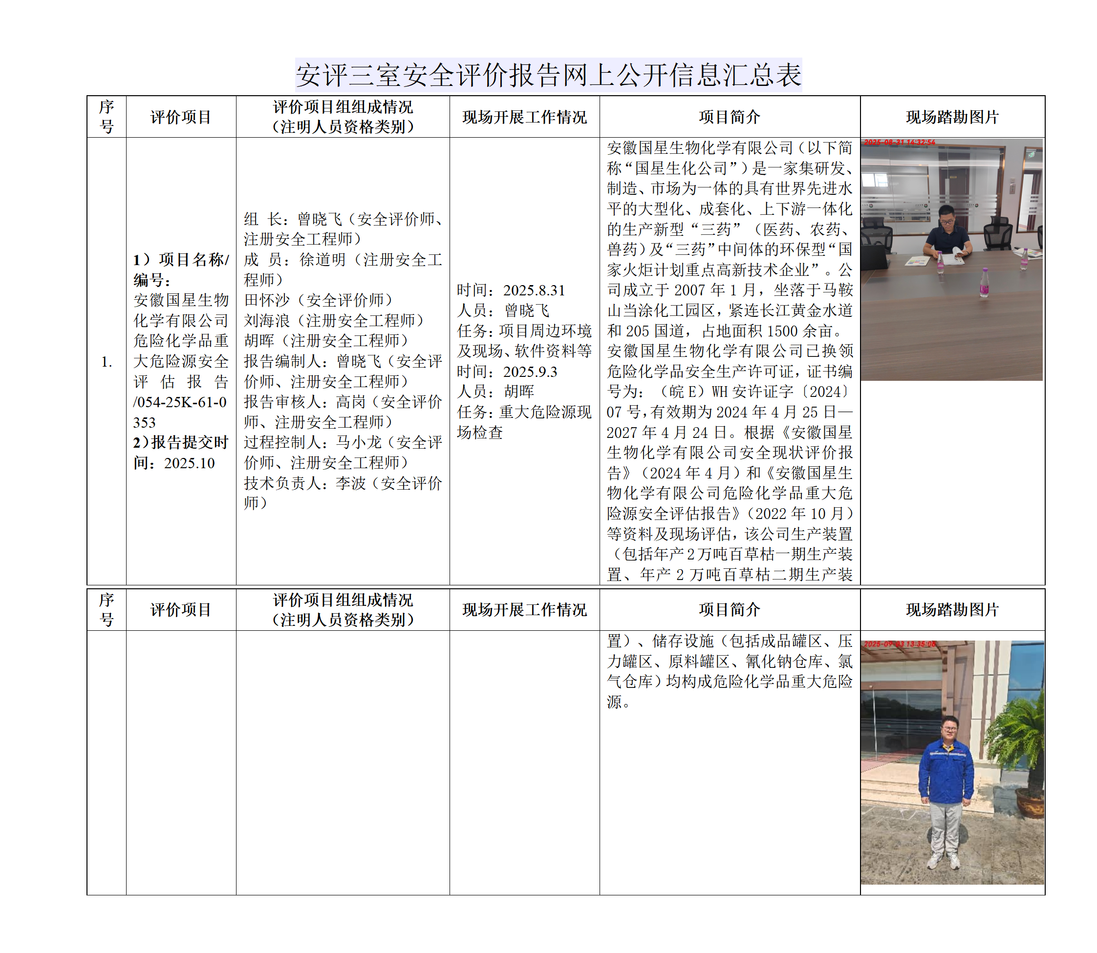 1)项目名称/编号:安徽国星生物化学有限公司危险化学品重大危险源安全评估报告/054-25K-61-0353 2)报告提交时间:2025.10 |