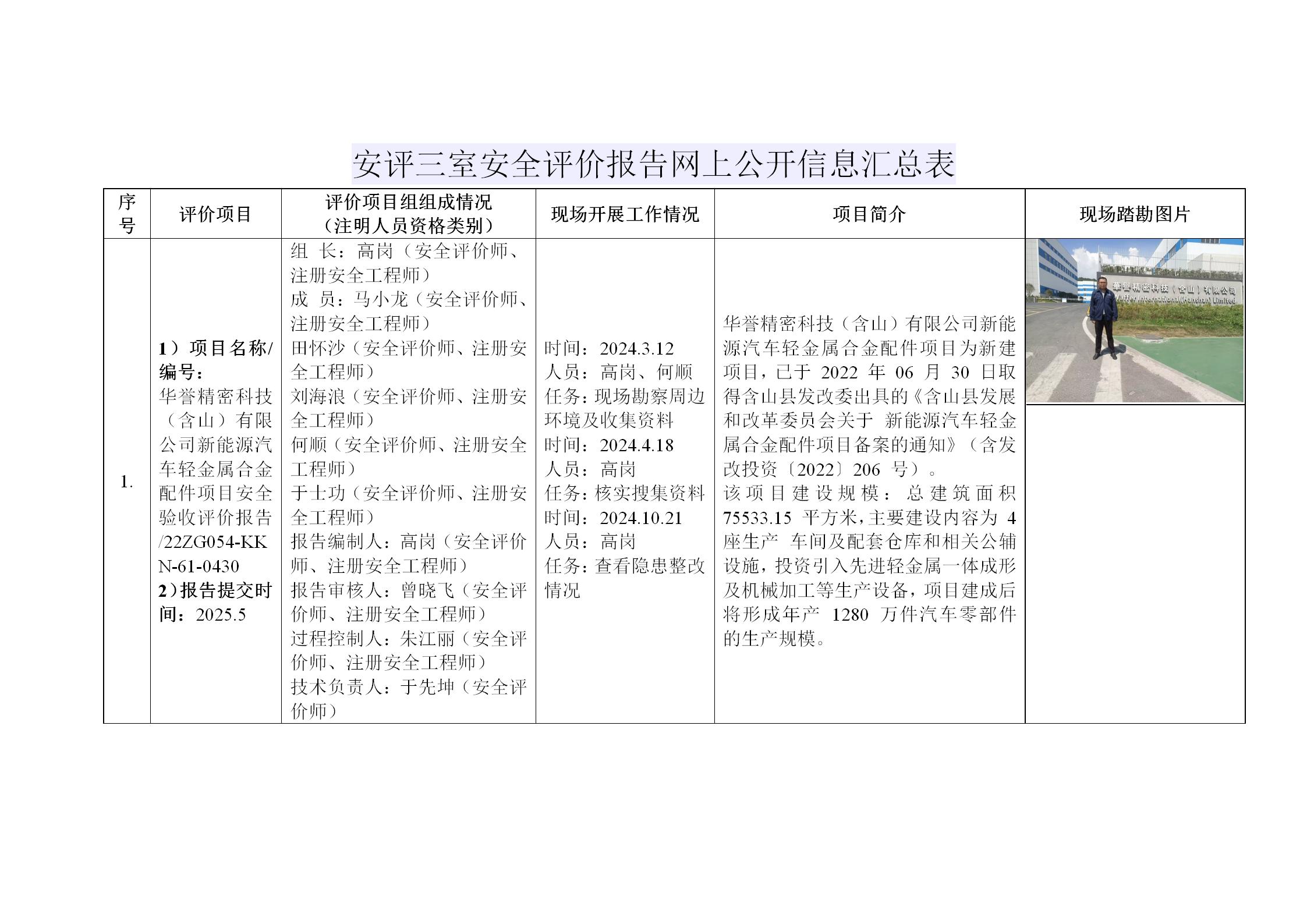 安评三室网上公开信息-华誉精密科技(含山)有限公司新能源汽车轻金属合金配件项目安全验收评价报告