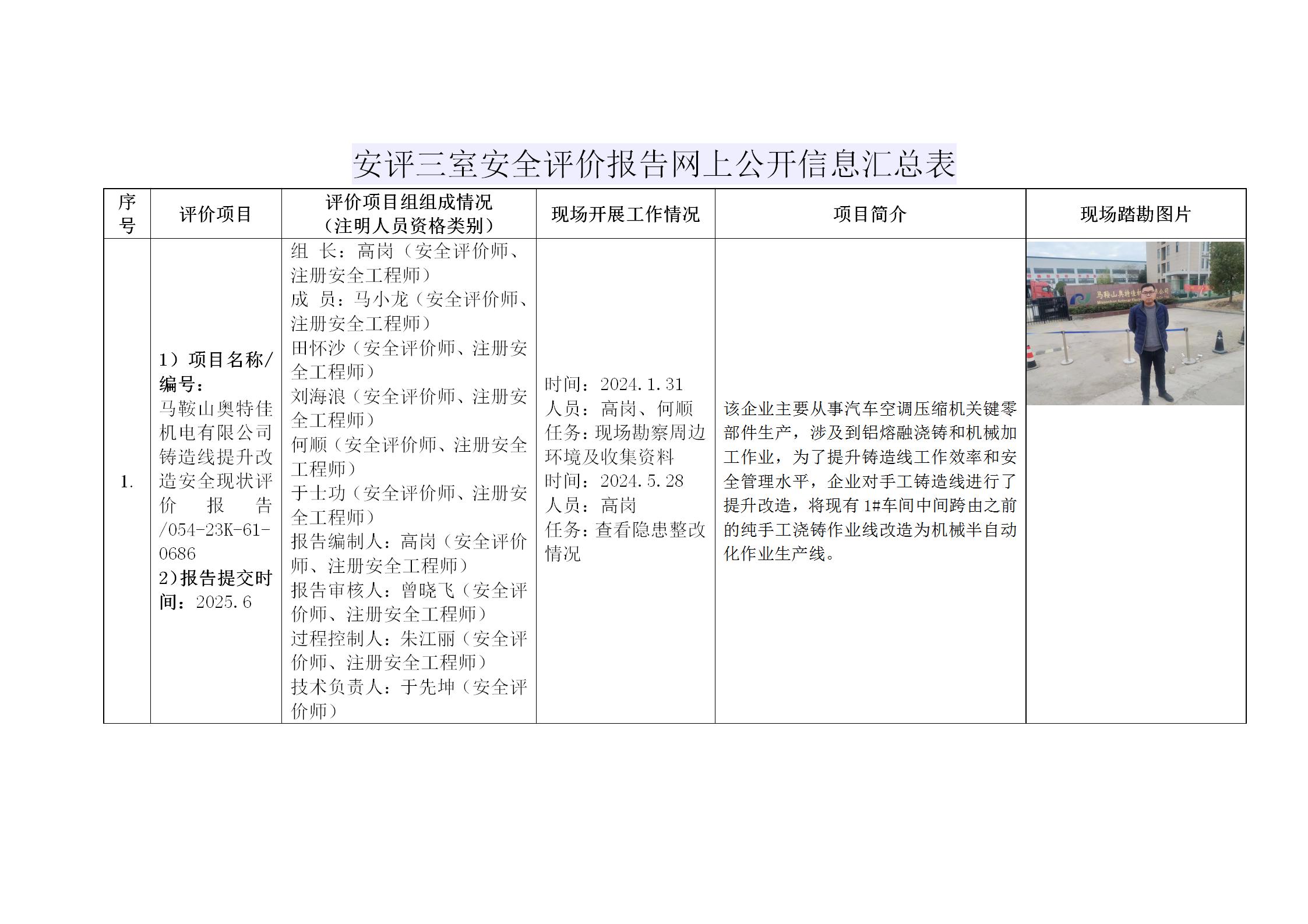 安评三室网上公开信息-马鞍山奥特佳机电有限公司铸造线提升改造安全现状评价报告
