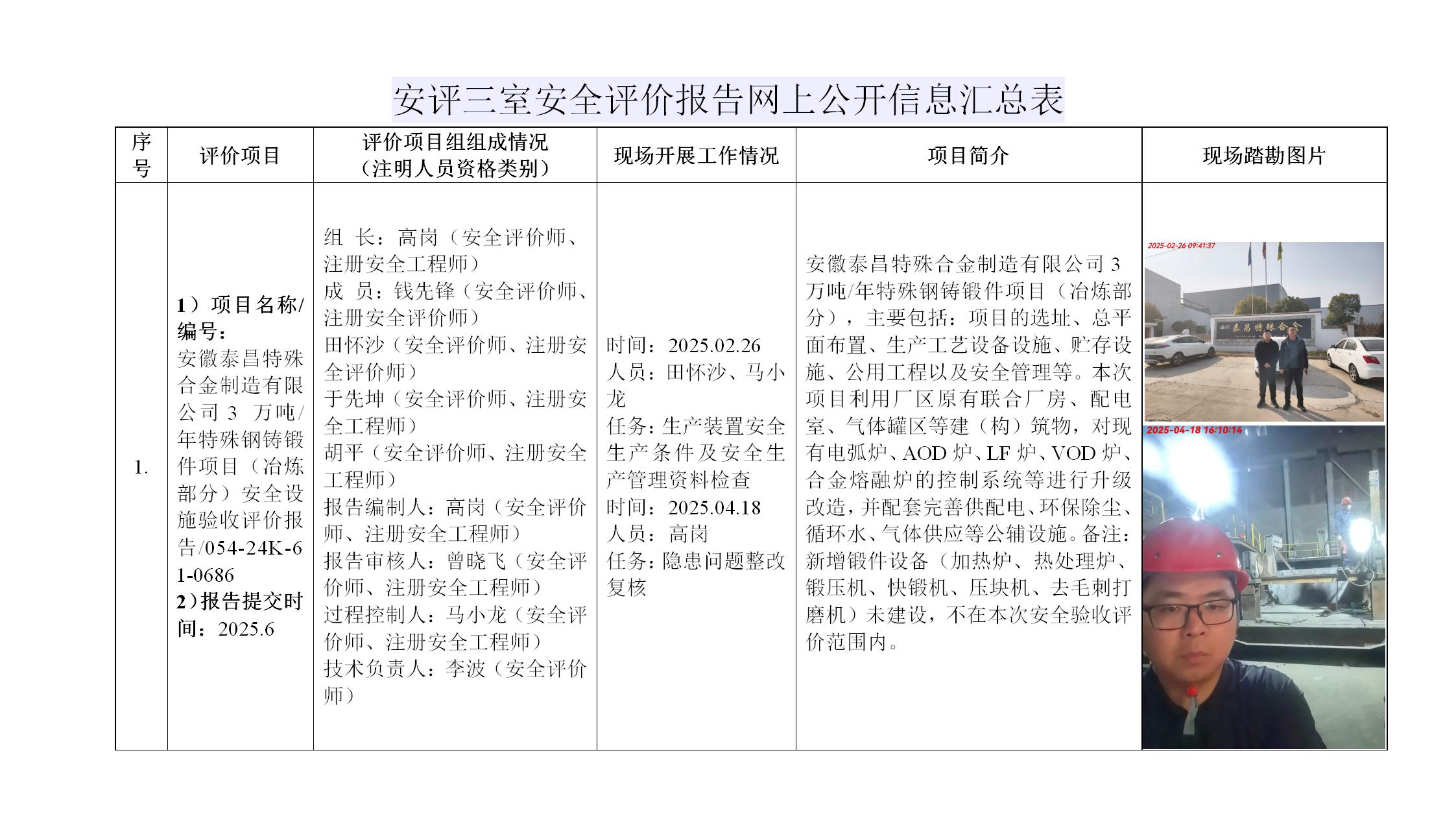1)项目名称/编号:安徽泰昌特殊合金制造有限公司3 万吨/年特殊钢铸锻件项目(冶炼部分)安全设施验收评价报告/054-24K-61-0686 2)报告提交时间:2025.6 |