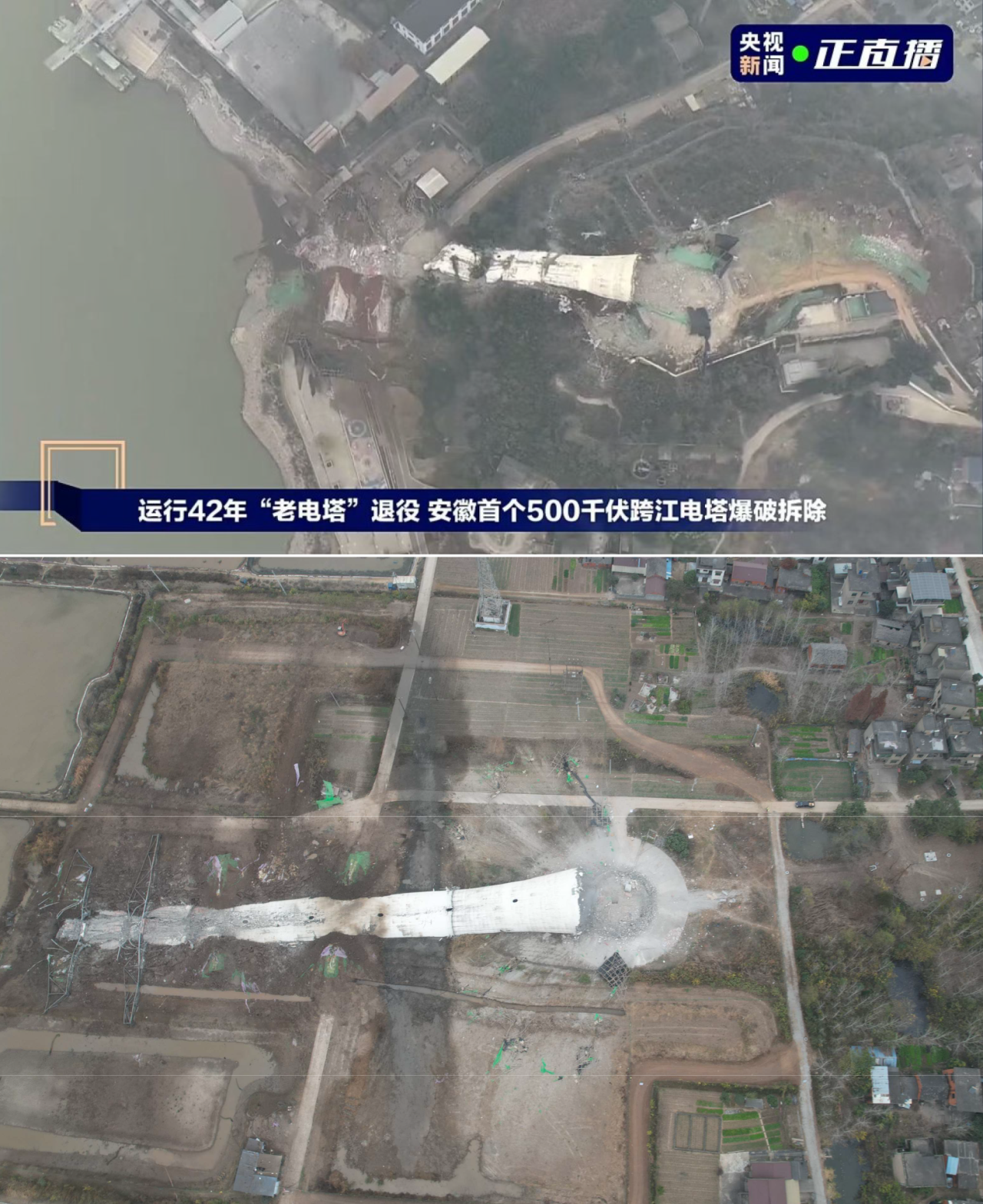 本次爆破的500kV肥繁线长江大跨越南北塔,是国家“西电东送”重点工程——甘肃至浙江±800千伏特高压直流输电工程的重要前期节点。拆除旧塔,是“让道于新”,以便在原通道内建设更高电压等级、更大输送容量的能源动脉。