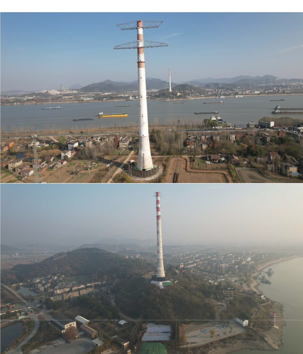 此次拆除的双塔建于1983年,高达160米,是迄今国内爆破拆除的最高跨江线塔,其结构复杂,横担巨大。真正的挑战源于极端复杂的周边环境:南北塔警戒区内共有近400户居民,最近民房距塔身仅74米;周边密布各类输电线路、地下管网、长江大堤、码头油库乃至寺庙古迹。北塔需保留部分横担,对倒塌精度要求严苛;南塔立于40米高山上,触地点距长江仅5米,必须严防塔体冲入江中或产生剧烈冲击飞溅。