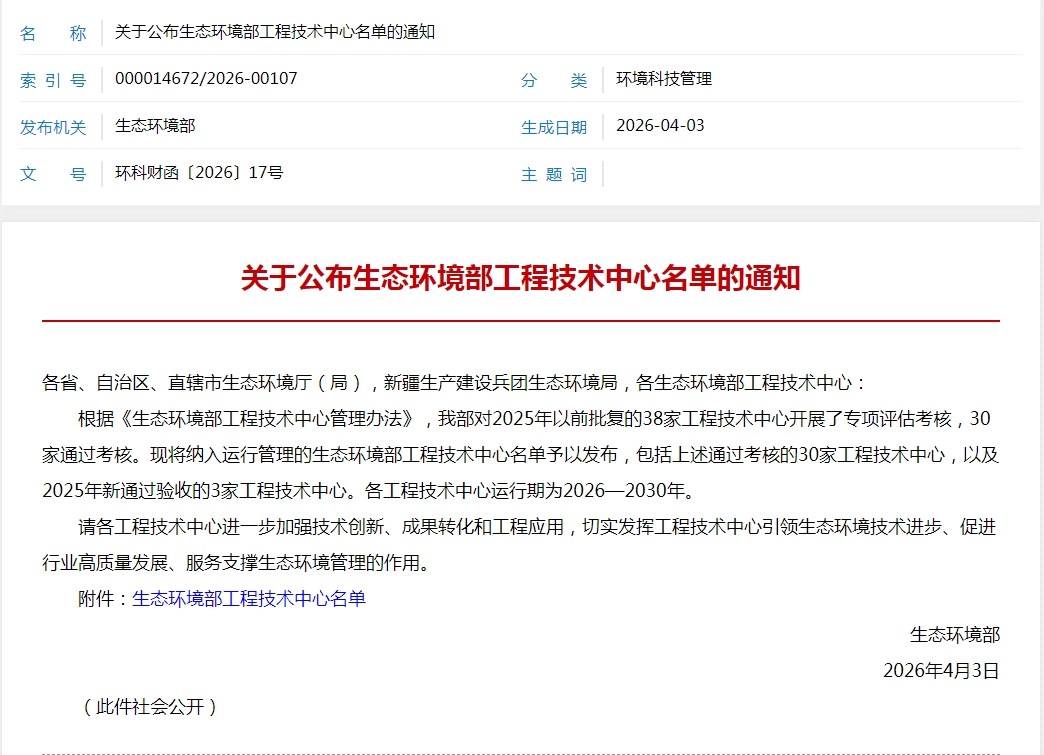 近日,生态环境部印发《关于公布生态环境部工程技术中心名单的通知》(环科财函〔2026〕17号),中钢矿院作为依托单位建设的生态环境部矿山固体废物处理与处置工程技术中心(下文简称“固废中心”)顺利通过专项评估考核,成功纳入2026—2030年生态环境部工程技术中心运行管理序列。