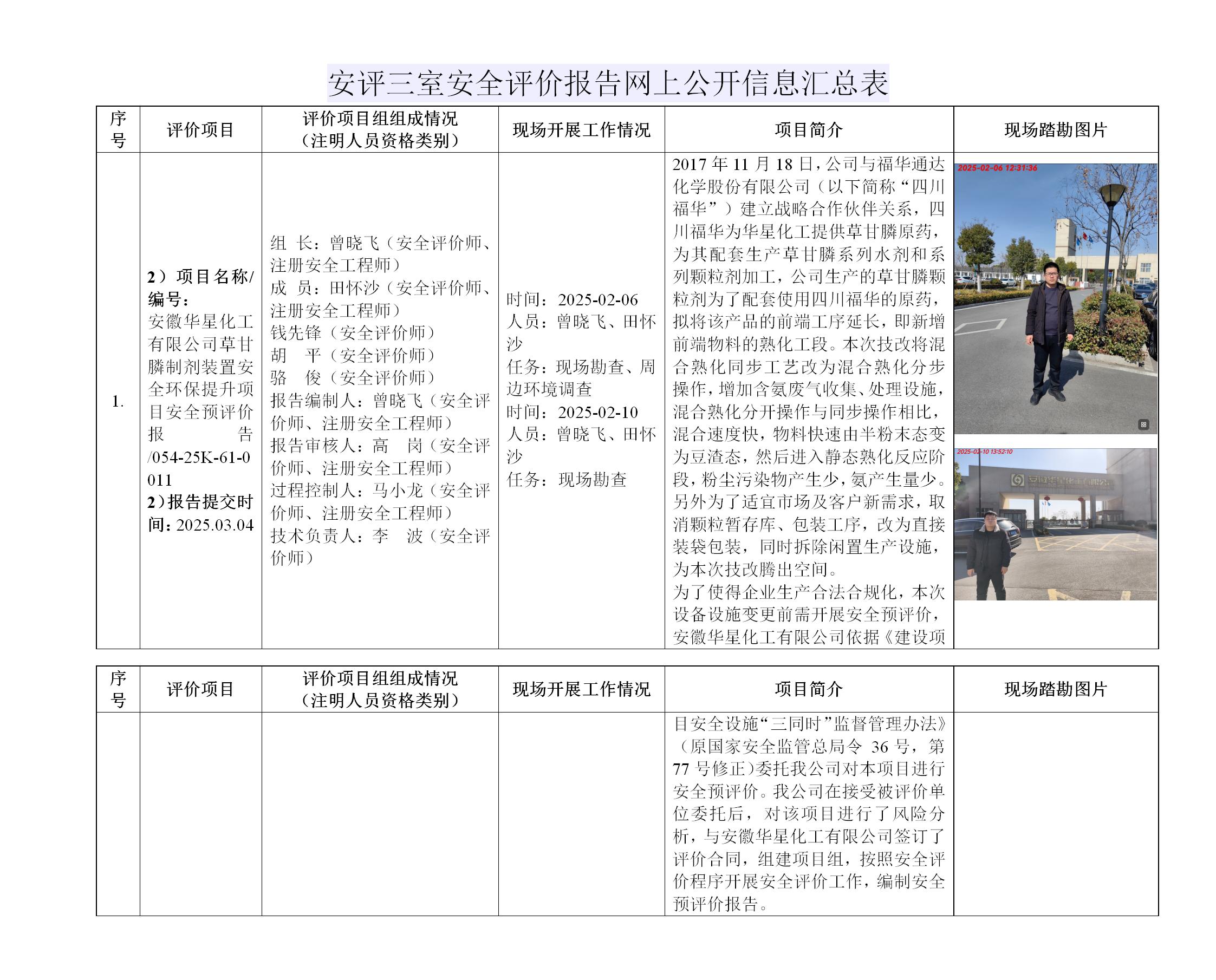 1)项目名称/编号:安徽华星化工有限公司草甘膦制剂装置安全环保提升项目安全预评价报告/054-25K-61-0011 2)报告提交时间:2025.3 |