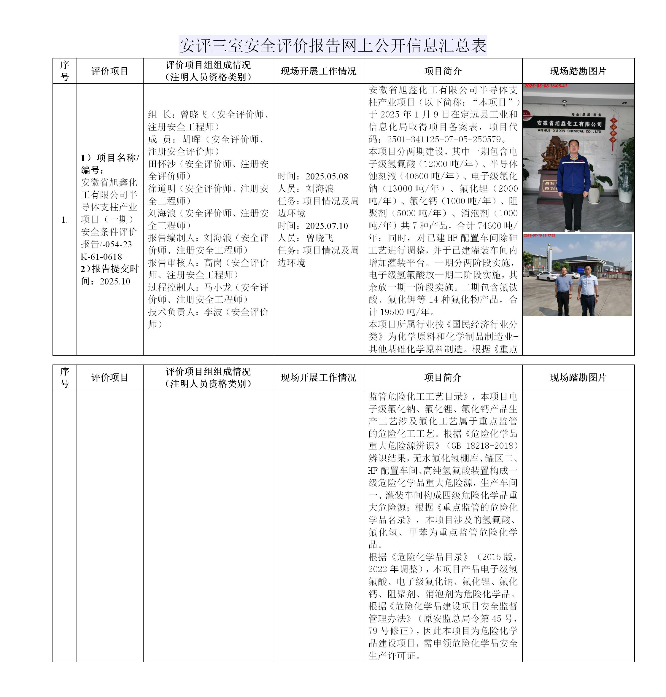 安评三室网上公开信息-安徽省旭鑫化工有限公司半导体支柱产业项目(一期)安全条件评价报告